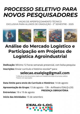 O Grupo de Pesquisa e Extensão em Logística Agroindustrial (Esalq-Log) está com inscrições abertas para vagas de novos pesquisadores para aperfeiçoamento técnico para análise de mercado logístico e participação em projetos de logística agroindustrial.